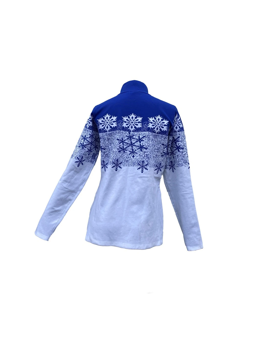 Die Weste hat einen Reißverschluss, der durch den Stehkragen geht. Das Wintermuster rundet die Strickjacke ab.