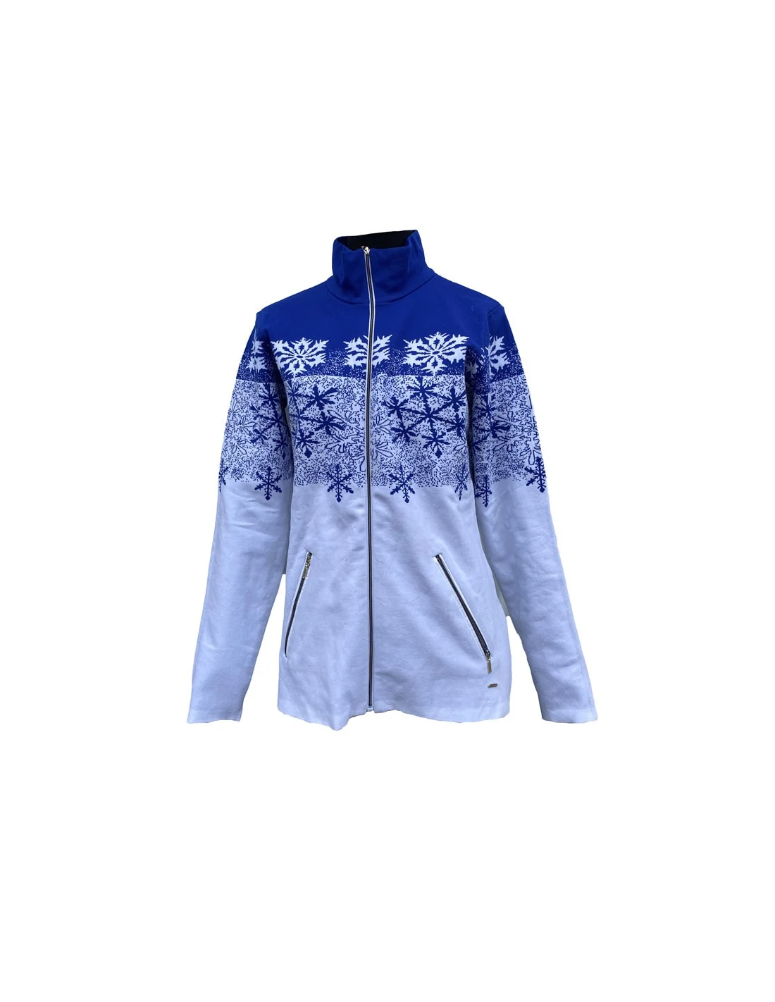 The vest has a zipper that goes through the stand-up collar. The winter pattern completes the cardigan.