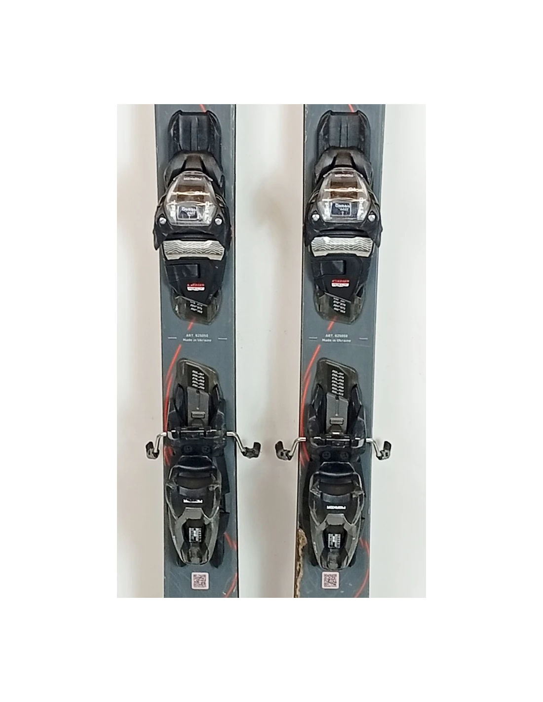 These skis have been used for a few seasons. They have visible scratches but are in good working condition. These signs of wear are typical and expected for skis that have already been ridden. They are a good choice for those looking for pre-owned skis that offer good performance with visible but limited wear.