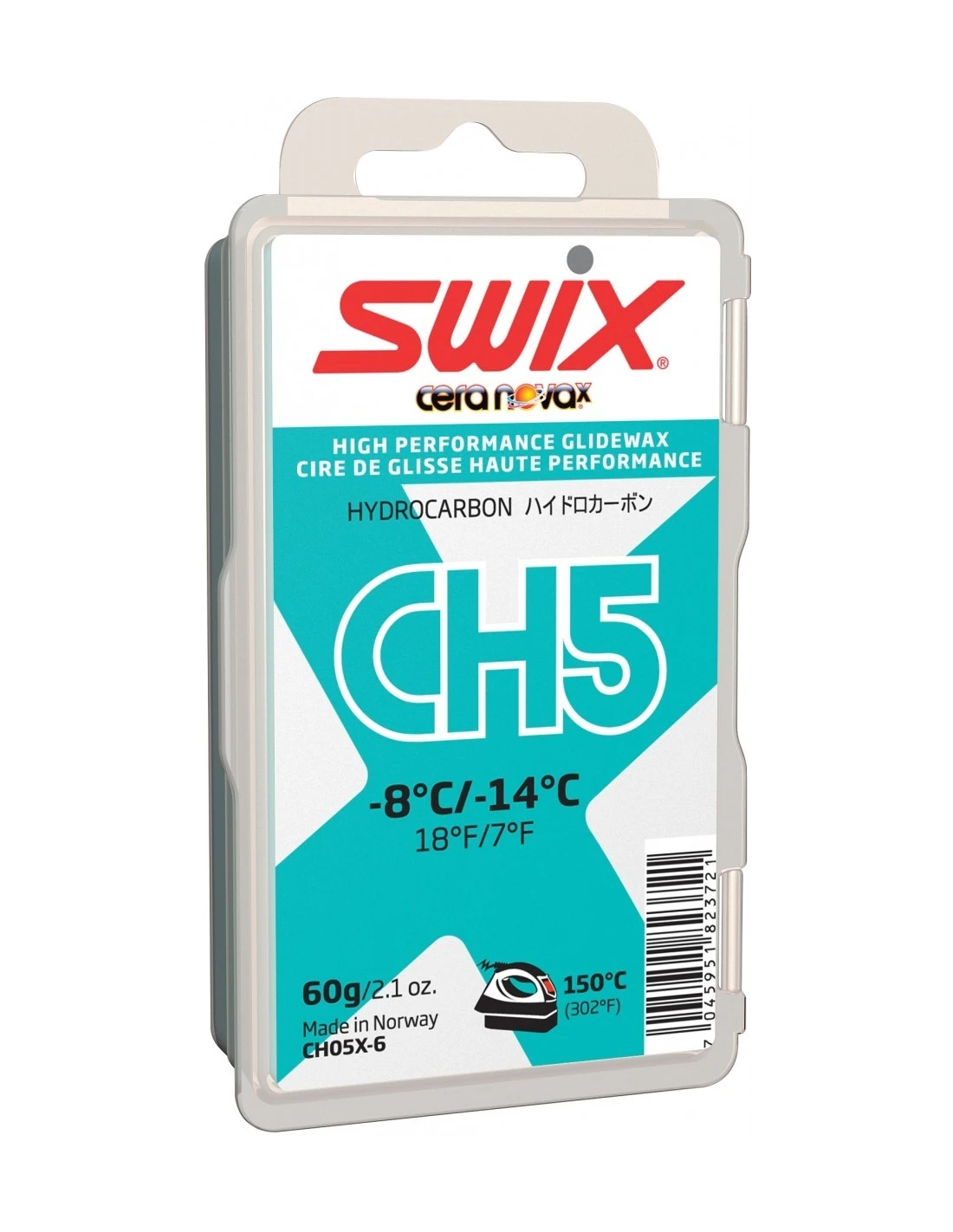 The CH5X TURQUOISE 60G wax from SWIX is based on hydrocarbon. It is a professional wax that is suitable for cold temperatures and wet snow. It is easier to apply than a series 4 but has lower gliding properties in case of temperature variations. It can be used as a racing wax or as a base before a powder.