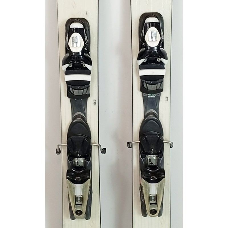 These skis have been used for a few seasons. They show visible scratches but are in good working condition. These signs of wear are typical and expected for skis that have already seen some runs. They represent a wise choice for those looking for used skis offering good performance with visible but contained wear.