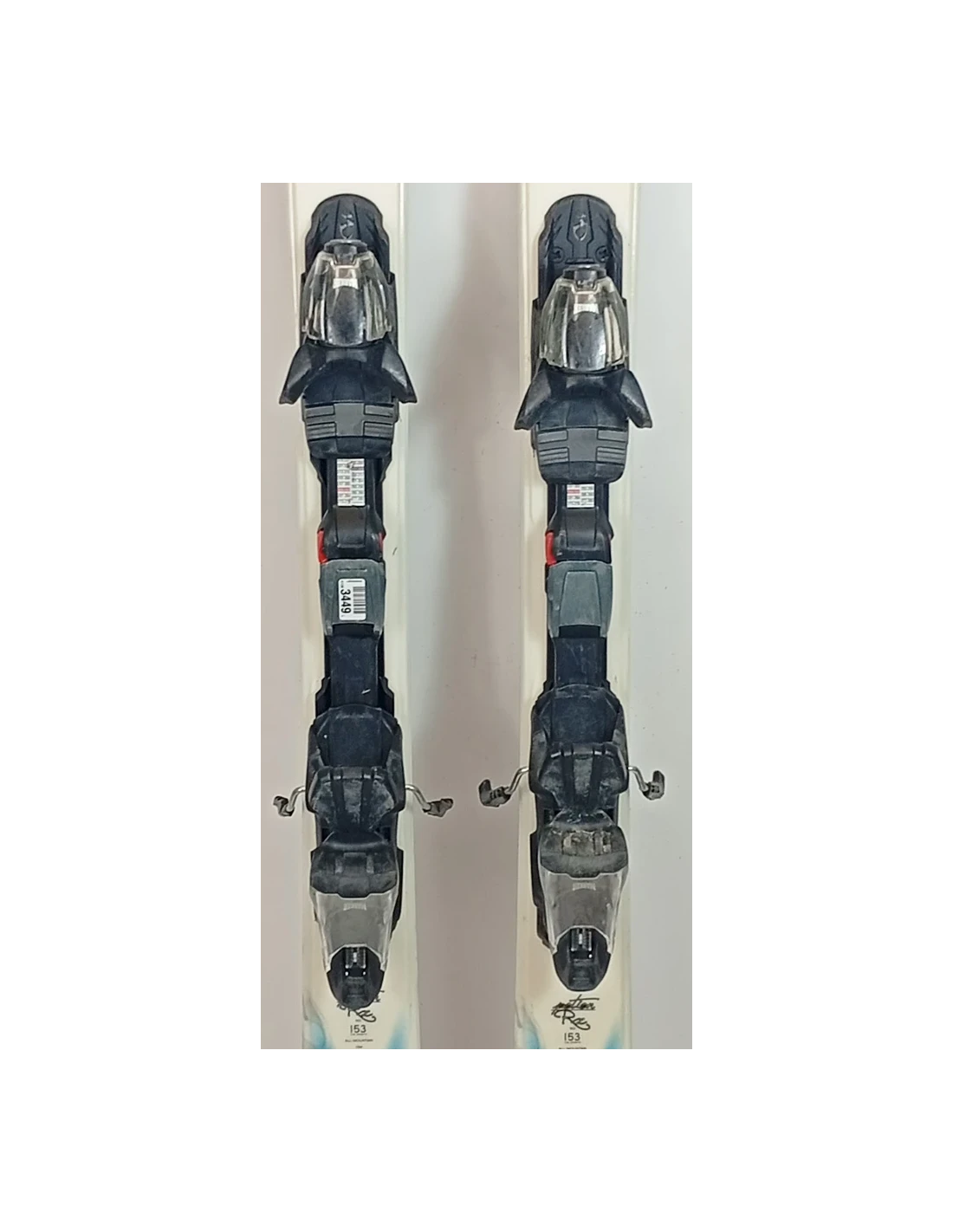 These skis have been used for a few seasons. They have visible scratches but are in good working condition. These signs of wear are typical and expected for skis that have already been ridden. They are a good choice for those looking for pre-owned skis that offer good performance with visible but limited wear.