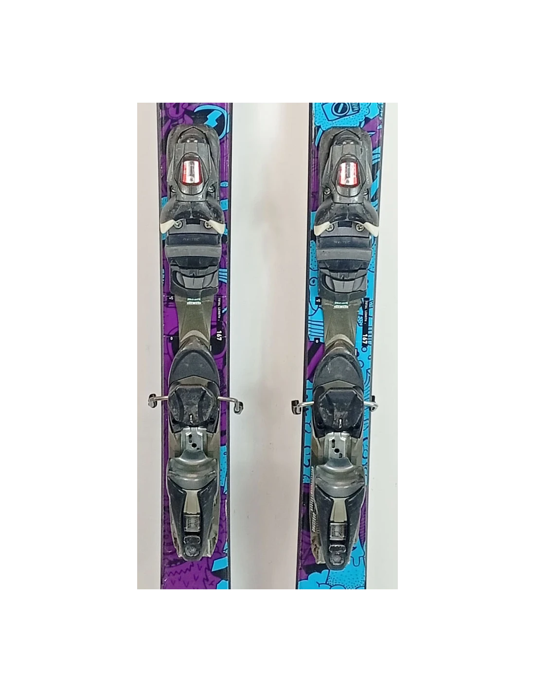 Estos esquís se han usado durante varias temporadas. Tienen rayones visibles, pero están en buen estado de funcionamiento. Estas señales de desgaste son típicas y esperadas en esquís ya usados. Son una buena opción para quienes buscan esquís de segunda mano que ofrezcan un buen rendimiento con un desgaste visible pero limitado.